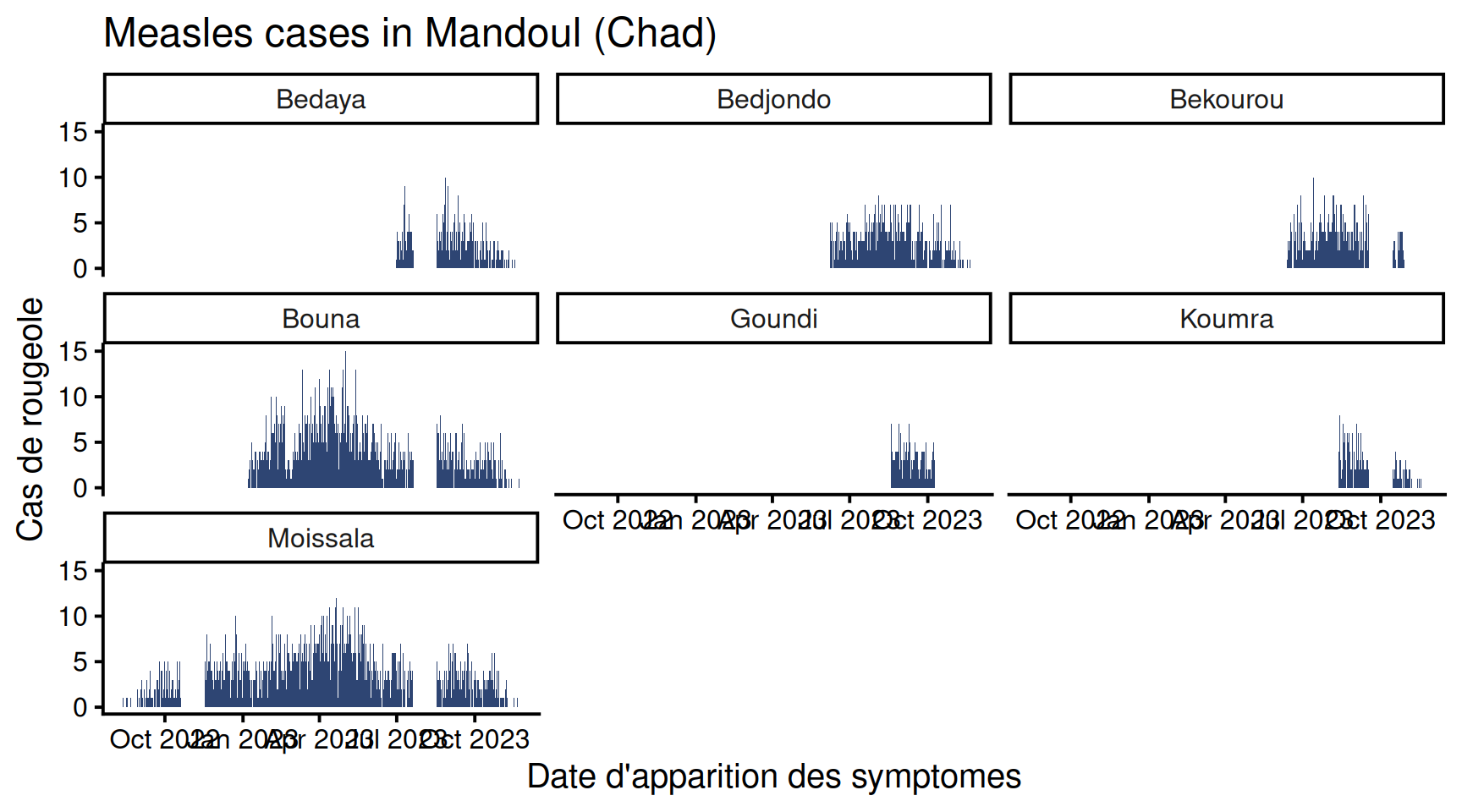 title = "Measles cases in Mandoul (Chad)") +